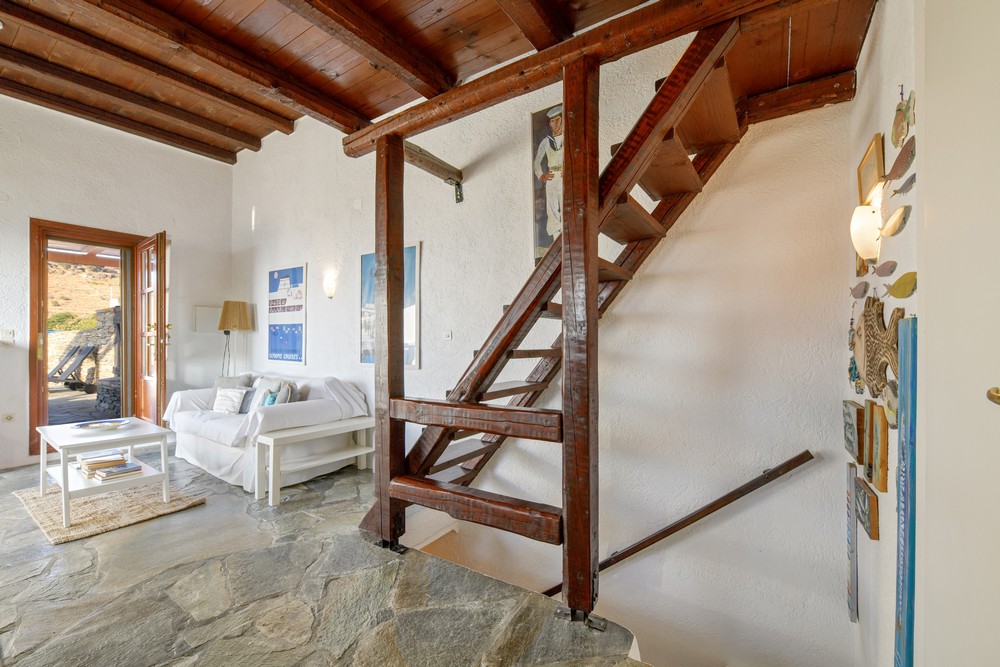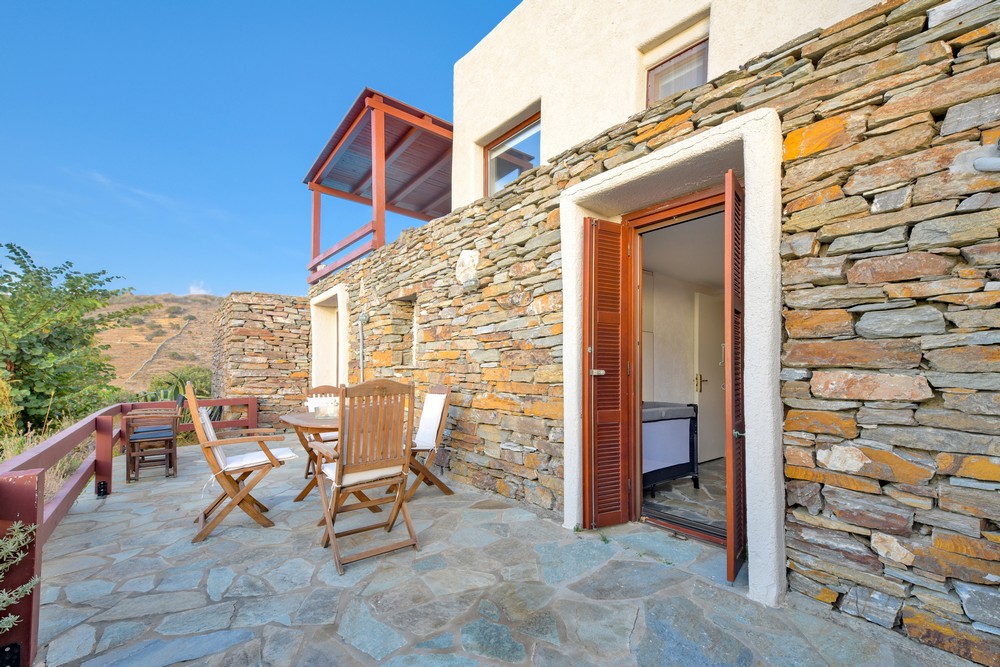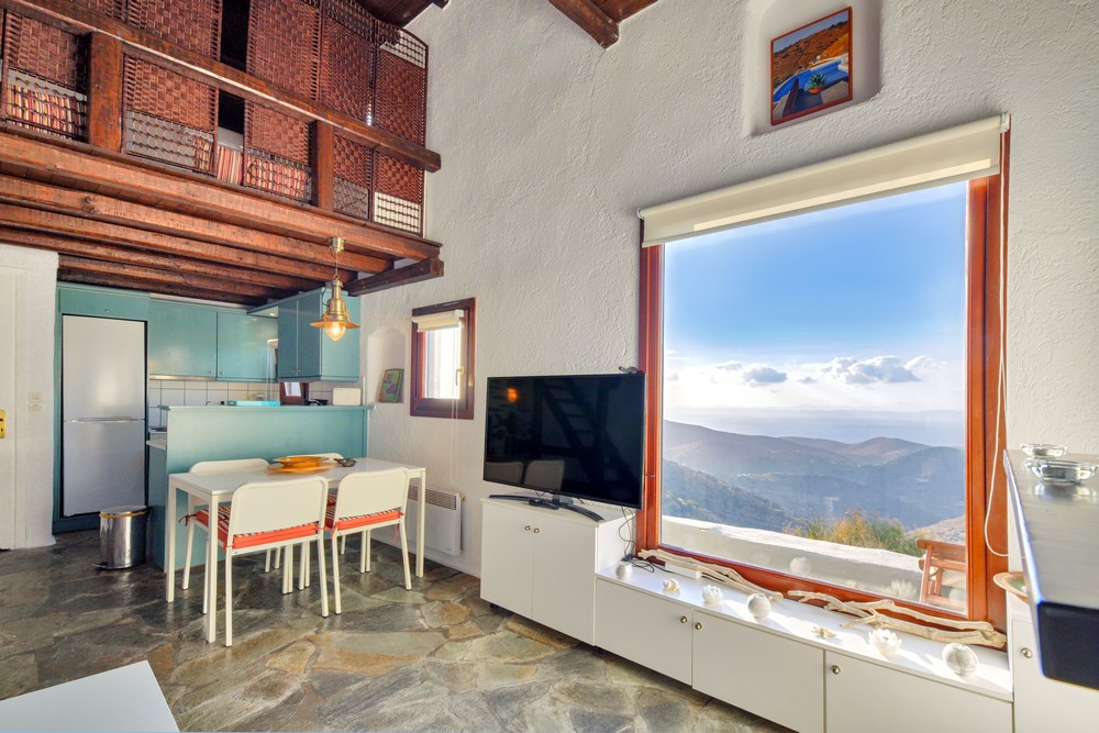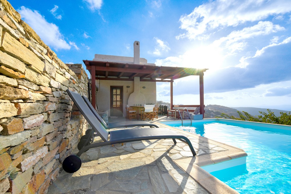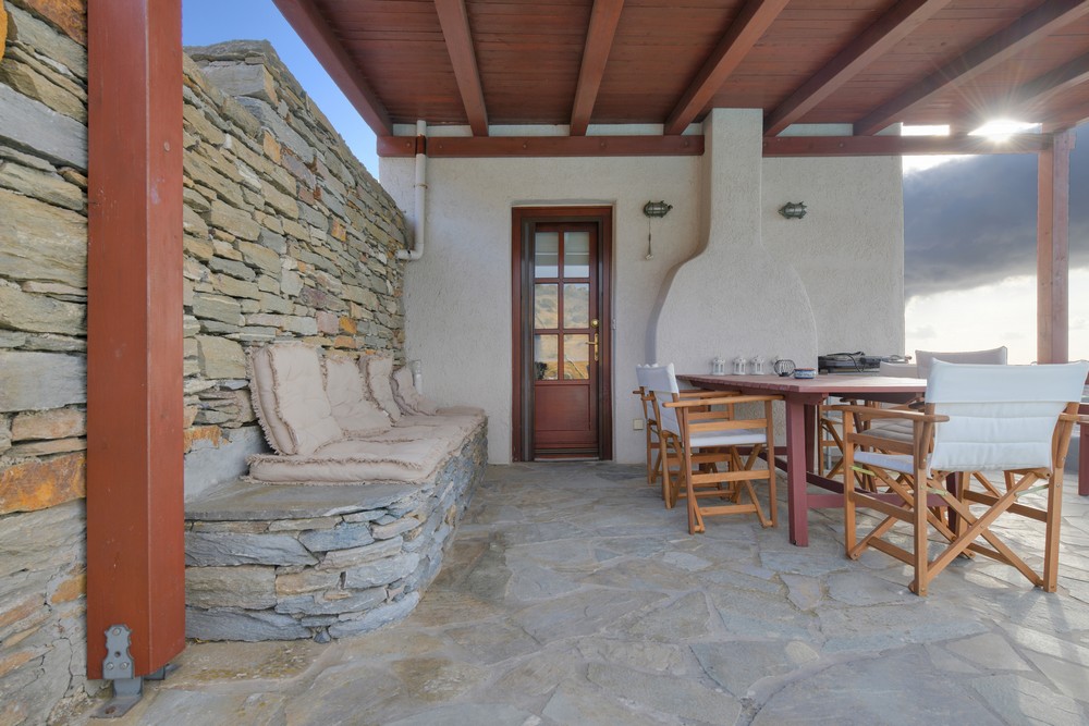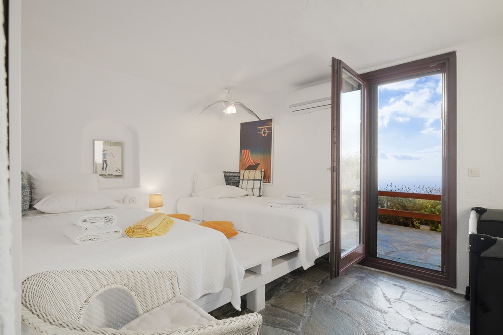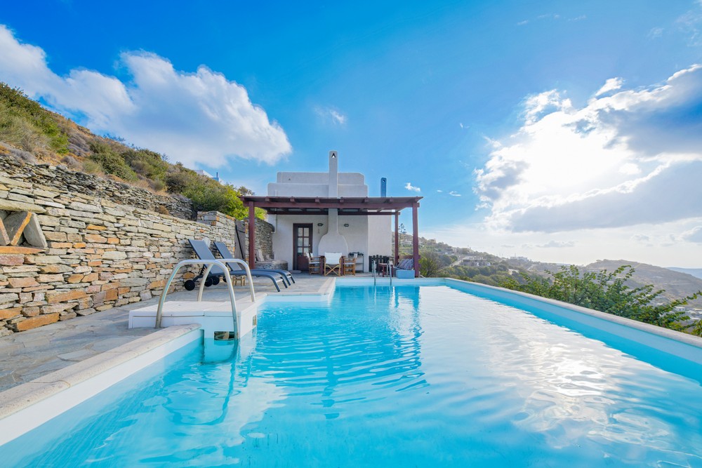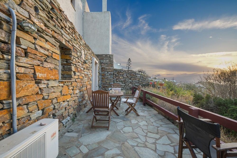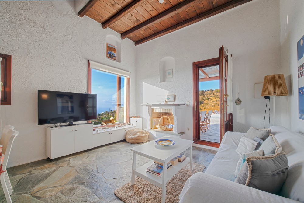 The house is 120 sq meters on a 1,000s meters plot of land near Chora (Ioulitha). Outside there is a swimming pool and terrace from where one has a breathtaking view of the surrounding area and the sea. Near the swimming pool there is a shaded dining/seating area.The ground floor of the house has a living room with fireplace and large windows that again give one a fantastic sea view. Near dining area there is a fully equipped kitchen and a w.c.  Near the kitchen there are stairs leading to an open-plan area that overlooks the living room, which can be used as the third bedroom. The floor below the ground level has two bedrooms and two bathrooms., both bedrooms lead onto a large patio which offers great views of the surrounding area and the sea.