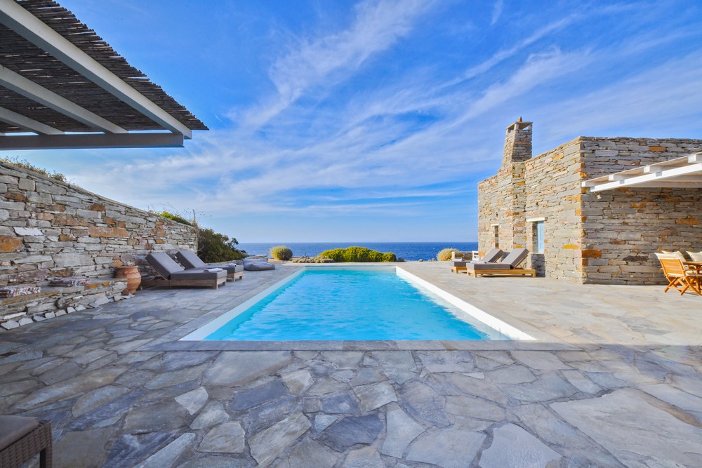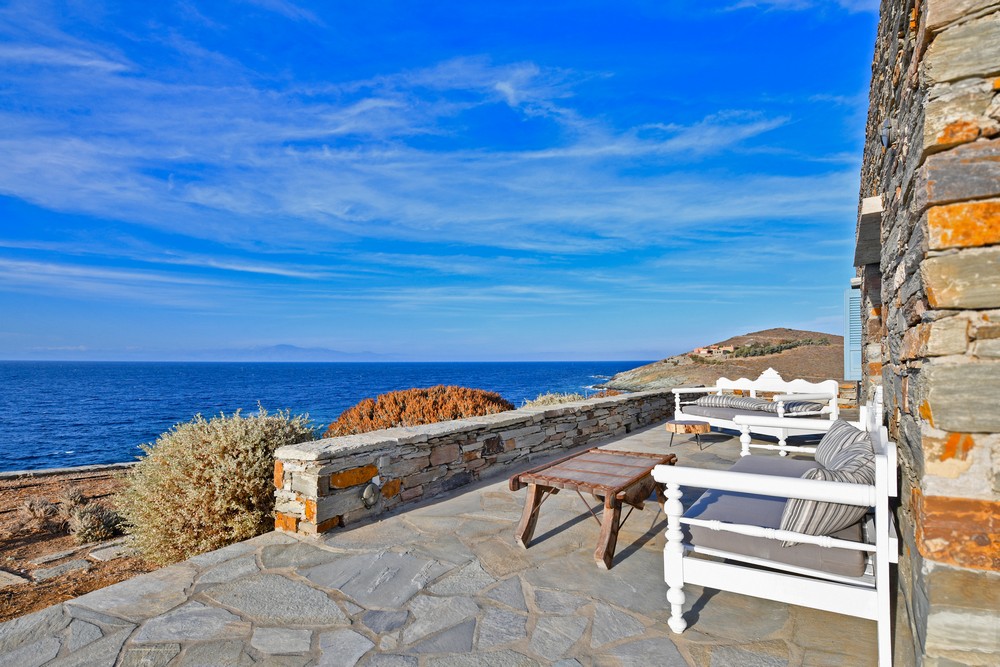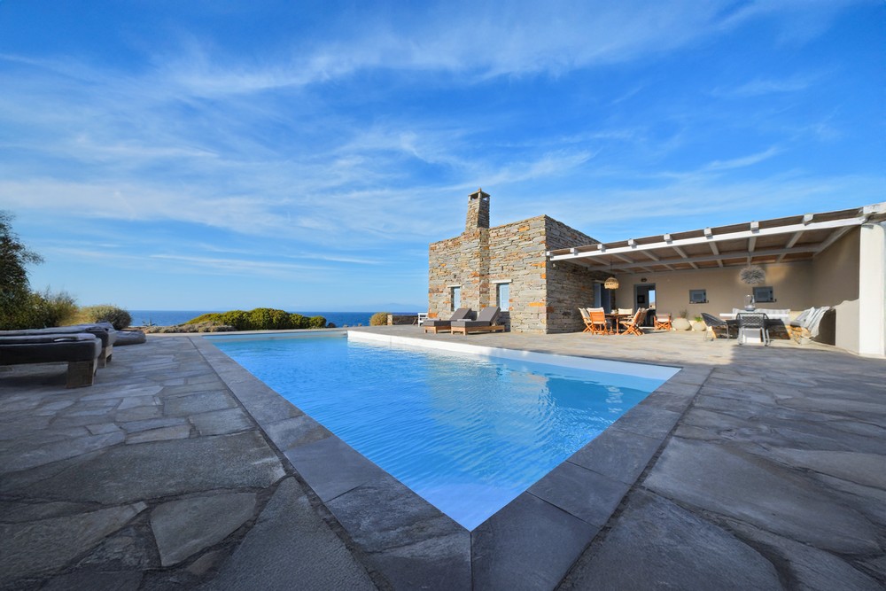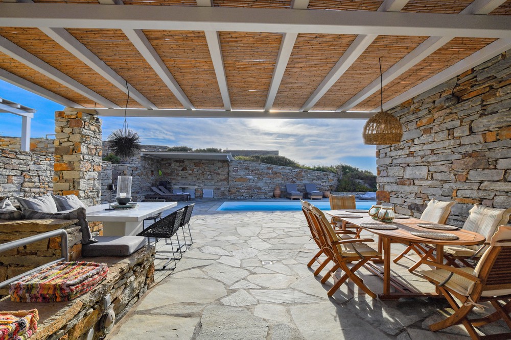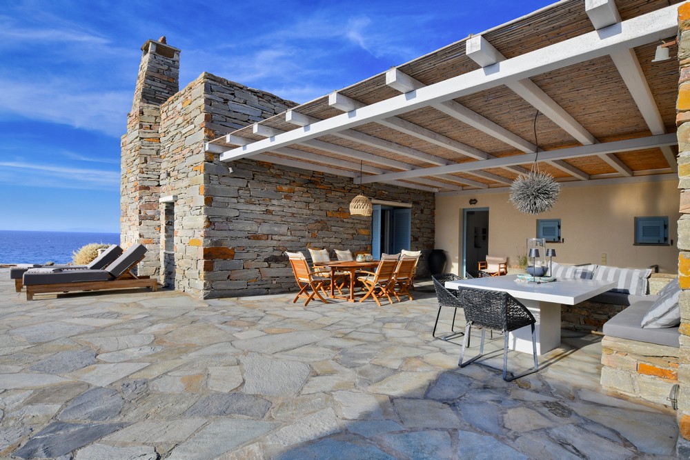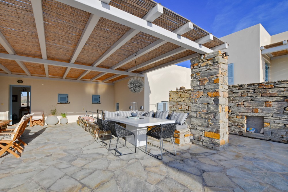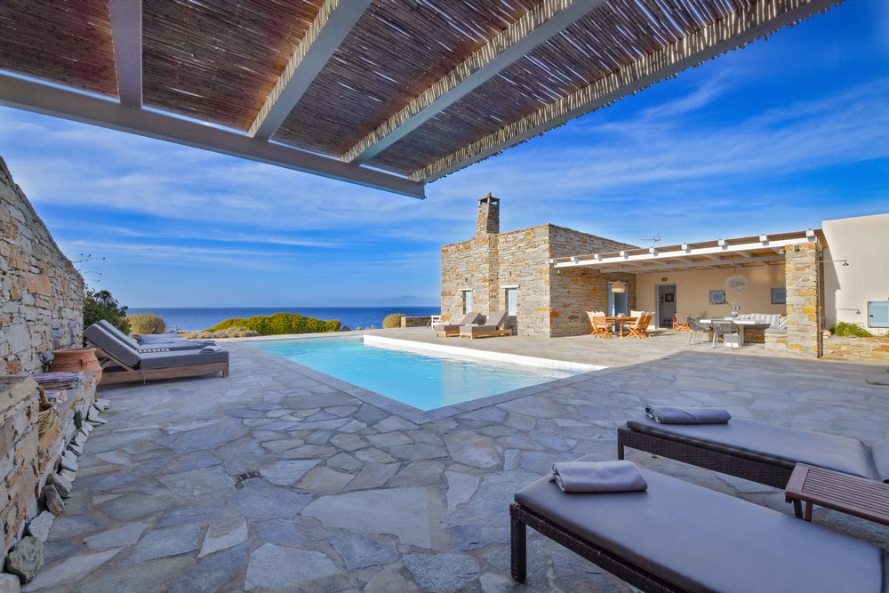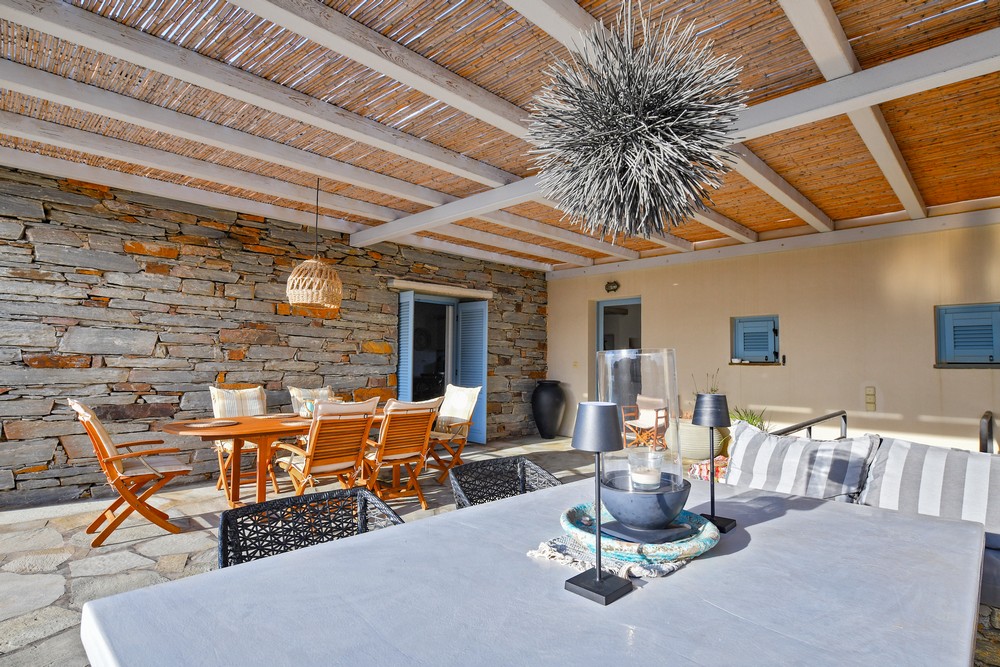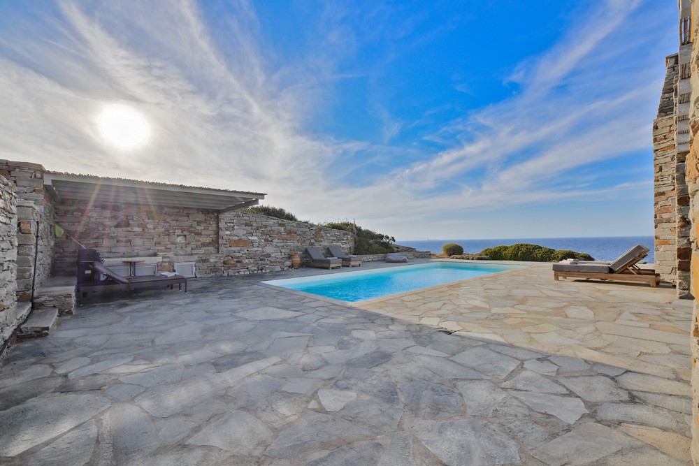 The property is on the waterfront, with access to the sea, in the area of Akrtotiri – Otzia, 10 minutes from the port of the island and one and a half hours from the airport. The villa is on 8,000 sq meters plot of land with the sea surrounding it on two sides, in a very quite and private location, but with easy access to restaurants and shops. Surrounding the villa are large terraces, all offering fantastic sea views, as well as a very large terrace with a sea water swimming pool to the side of the villa, where one can relax on one of the sunbeds with a glass of wine while enjoying the sea view as well as the amazing sunsets. Near the swimming pool is a large shaded area with a seating and dining area, which leads directly into the villa.