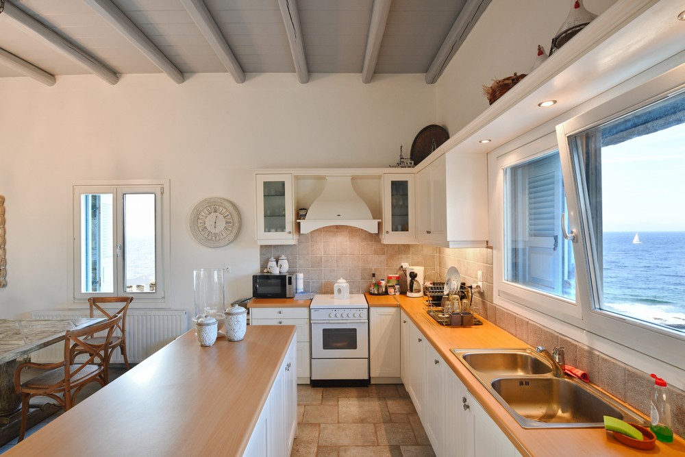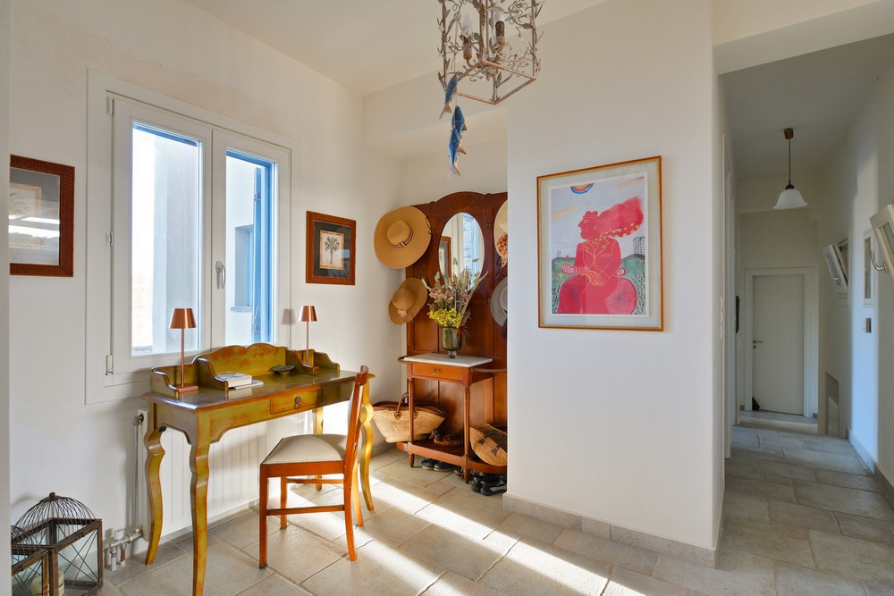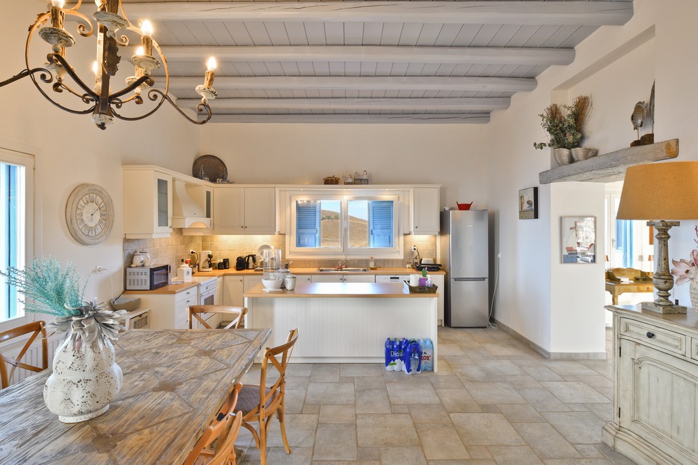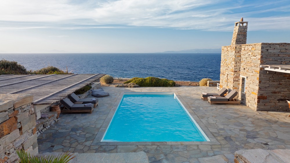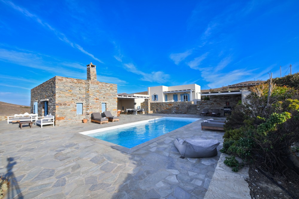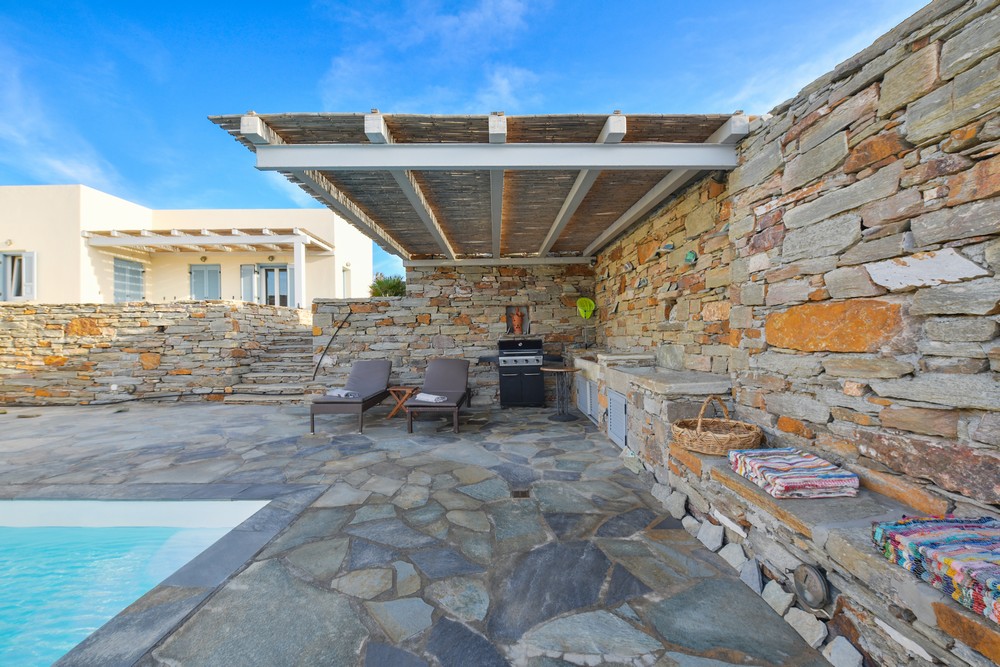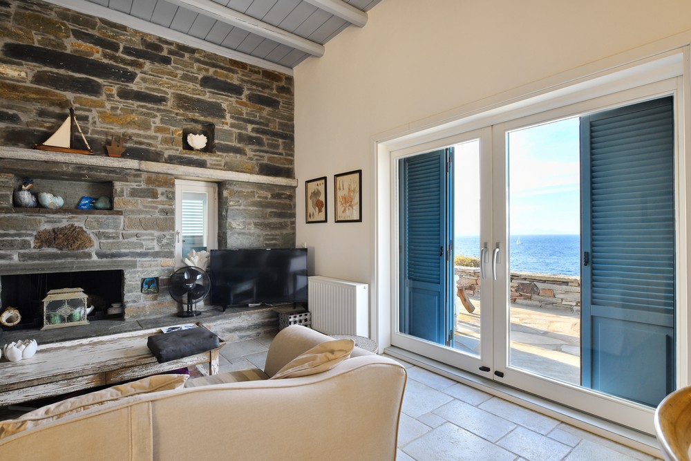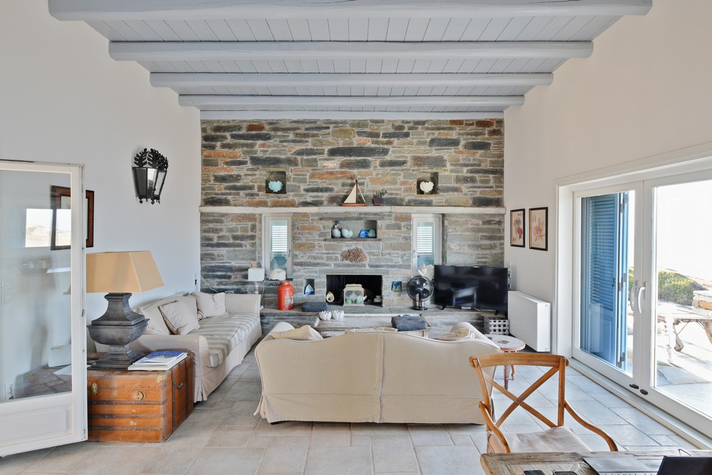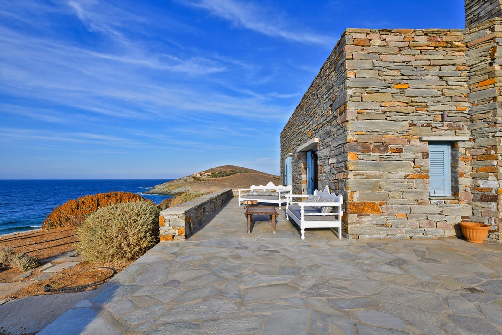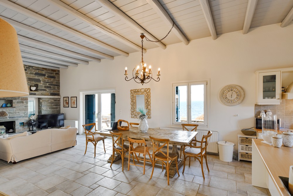 The property is on the waterfront, with access to the sea, in the area of Akrtotiri – Otzia, 10 minutes from the port of the island and one and a half hours from the airport. The villa is on 8,000 sq meters plot of land with the sea surrounding it on two sides, in a very quite and private location, but with easy access to restaurants and shops. Surrounding the villa are large terraces, all offering fantastic sea views, as well as a very large terrace with a sea water swimming pool to the side of the villa, where one can relax on one of the sunbeds with a glass of wine while enjoying the sea view as well as the amazing sunsets. Near the swimming pool is a large shaded area with a seating and dining area, which leads directly into the villa.